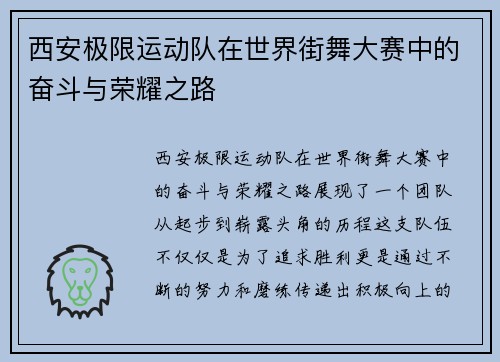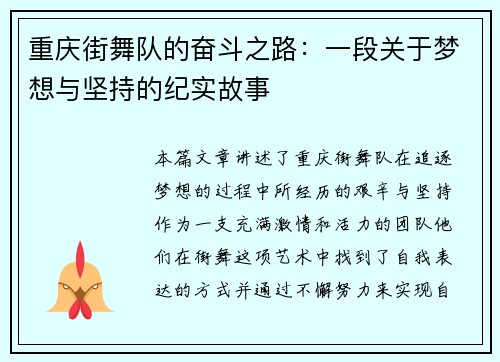阅读重庆街舞队在世界滑板锦标赛中的逆袭之旅,是一段充满激情与奋斗的青春故事。作为中国年轻力量的代表,重庆街舞队的成员们在这场国际性的赛事中展现了卓越的团队精神和无畏的青春力量。在激烈的竞争中,他们不仅挑战自我,还与其他国家的优秀选手同台竞技,展示了中国街舞文化的独特魅力。通过艰苦训练与团结协作,他们从最...